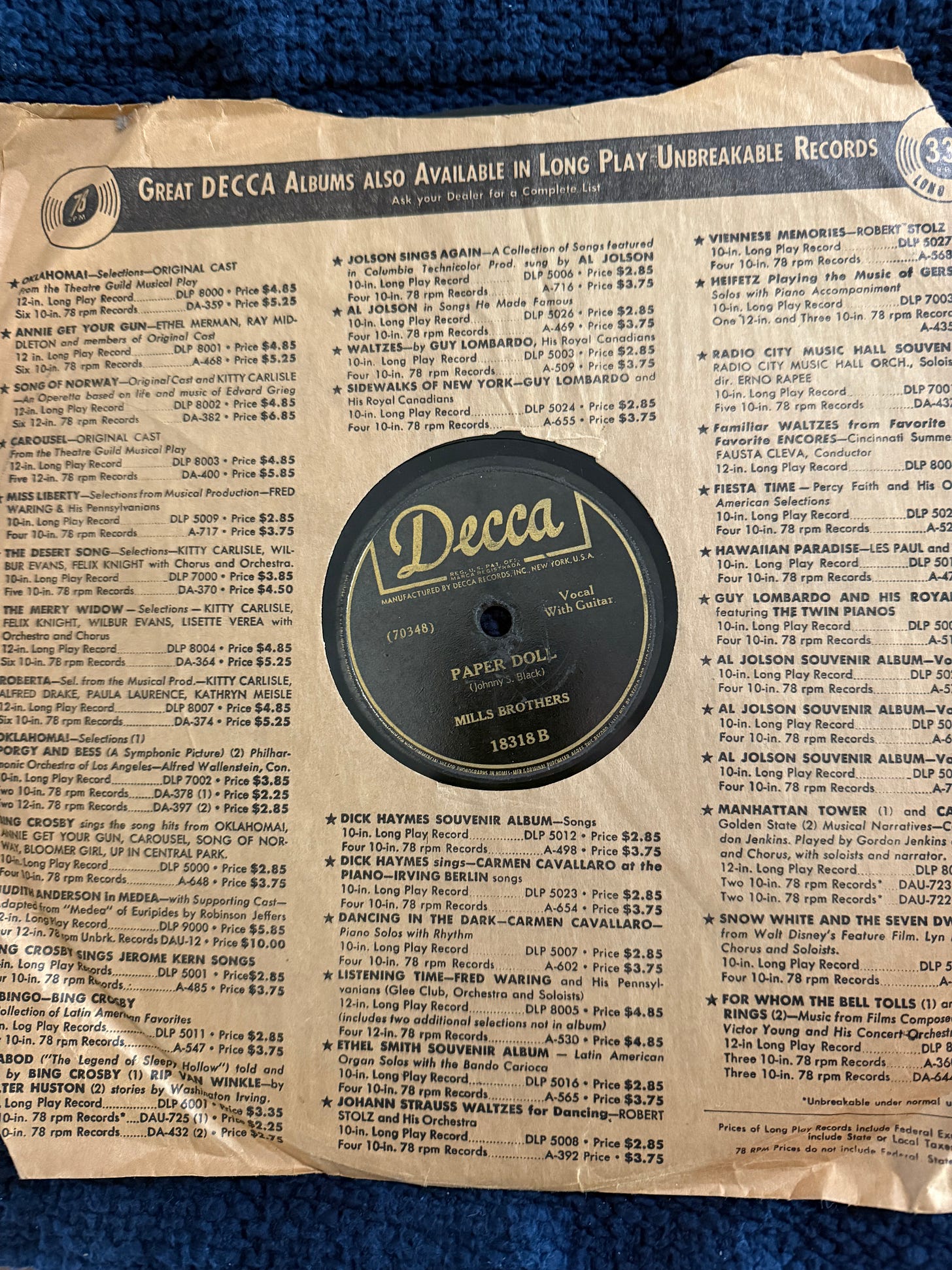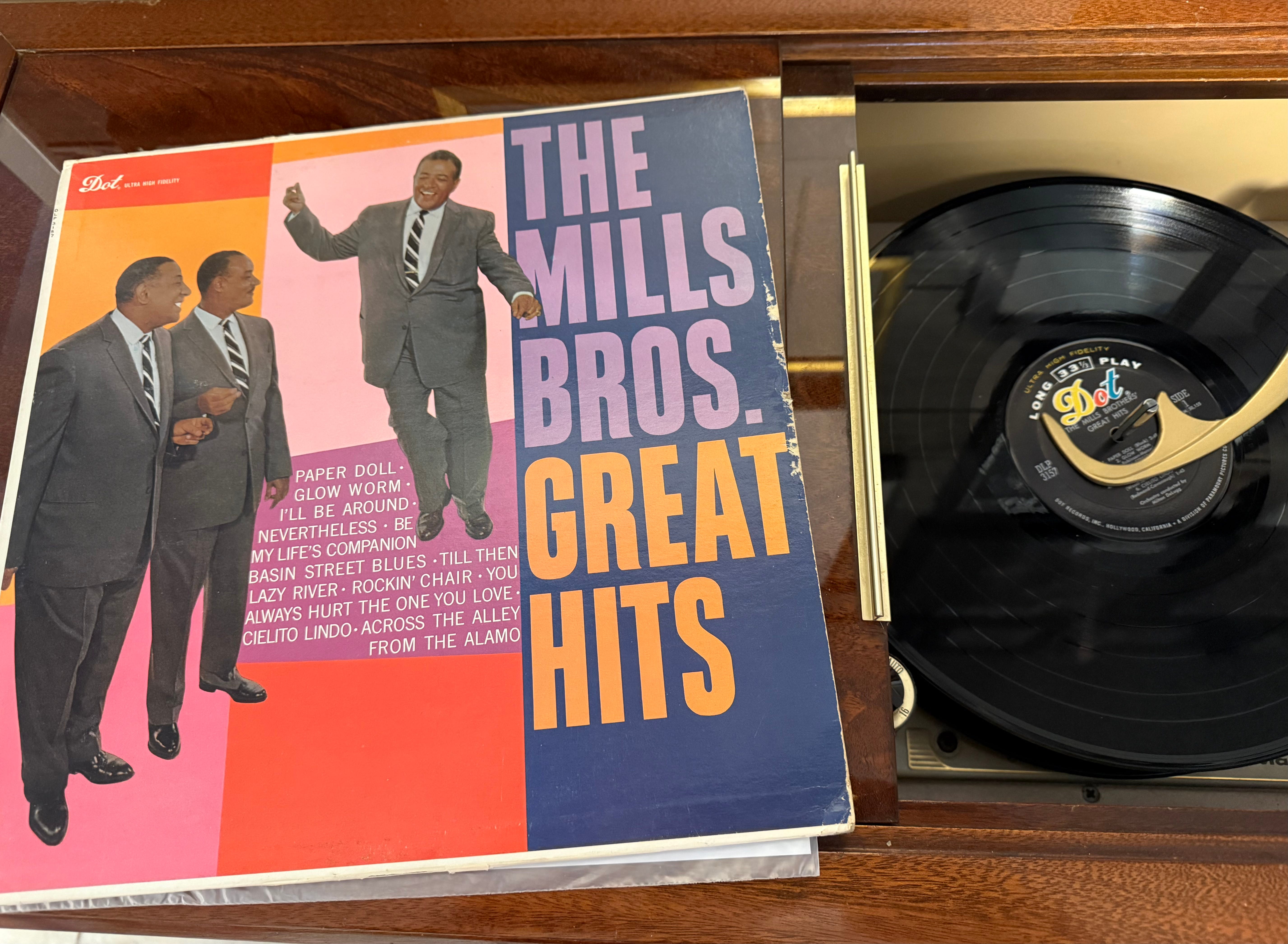 Yes, amid the countless Dan Fogelbergs and Mantovanis (and a surprisingly huge number of Moody Blues albums), there was this: The Mills Brothers Great Hits.” My mother’s collection of 78s – which she gave to me just days before she passed away – included the Brothers’ “Paper Doll.” And here, the cover, the label, the condition, the track listing – they all seemed to add up to being worth the dollar with which I was about to part.